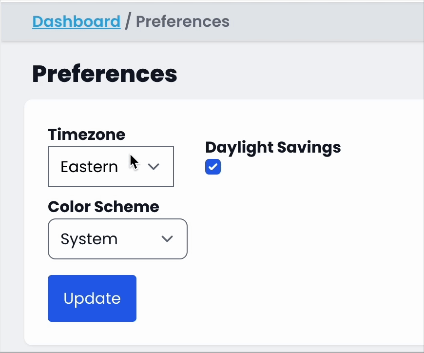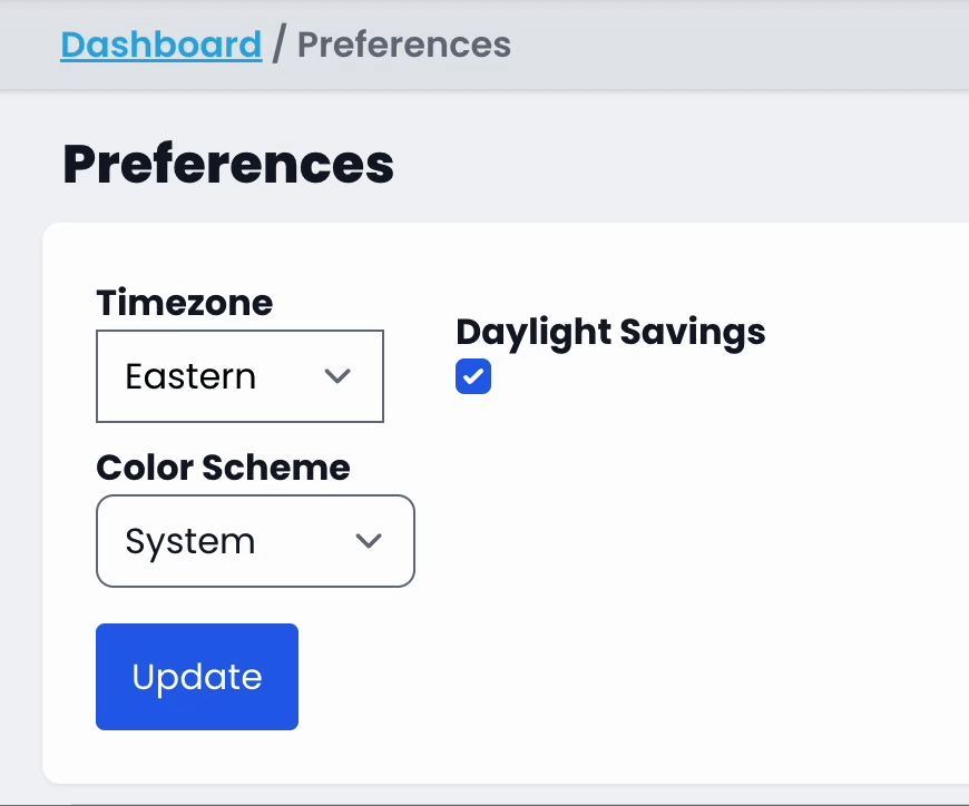 The preferences page allows you to set your display timezone and toggle between light & dark mode.